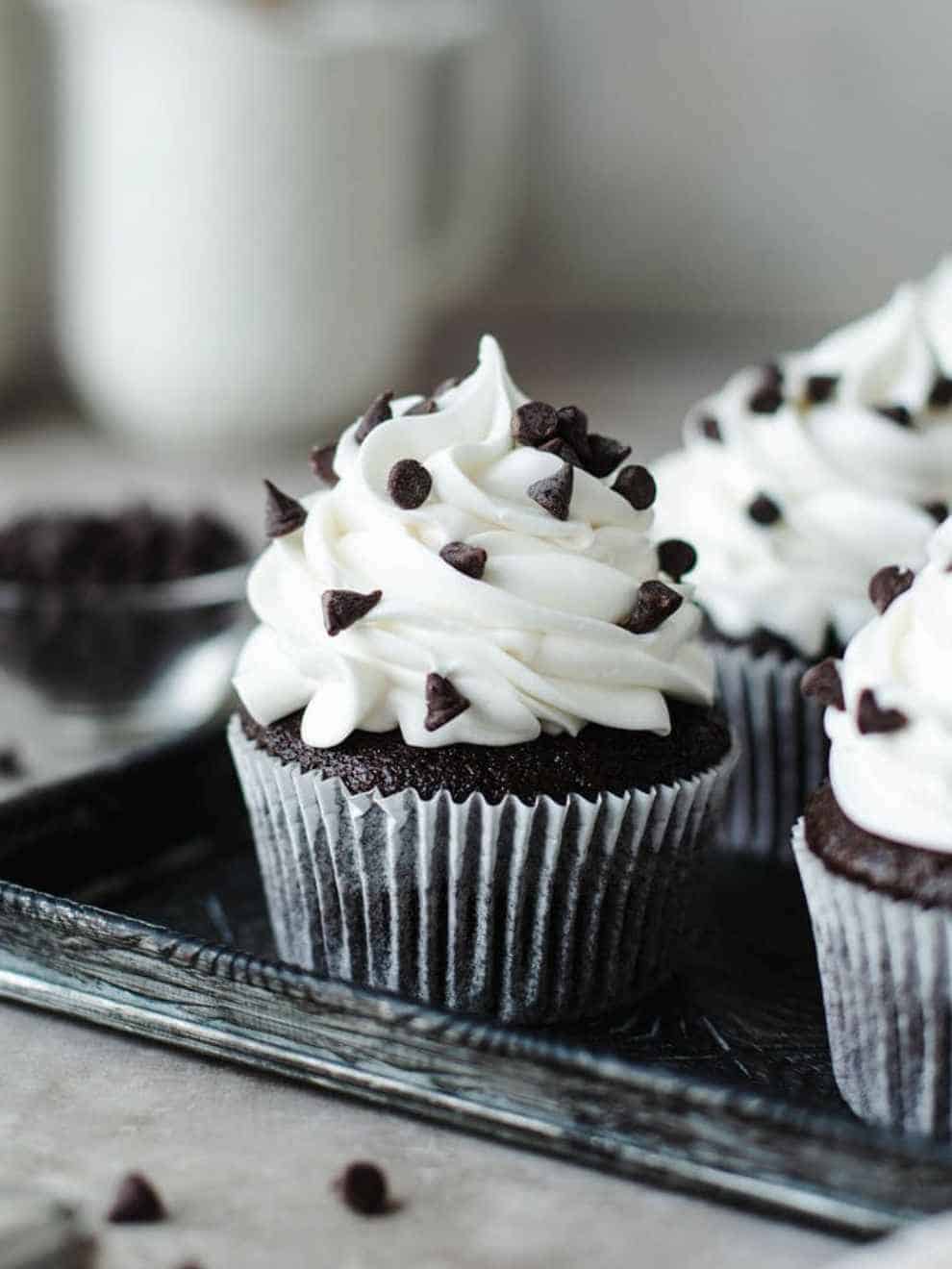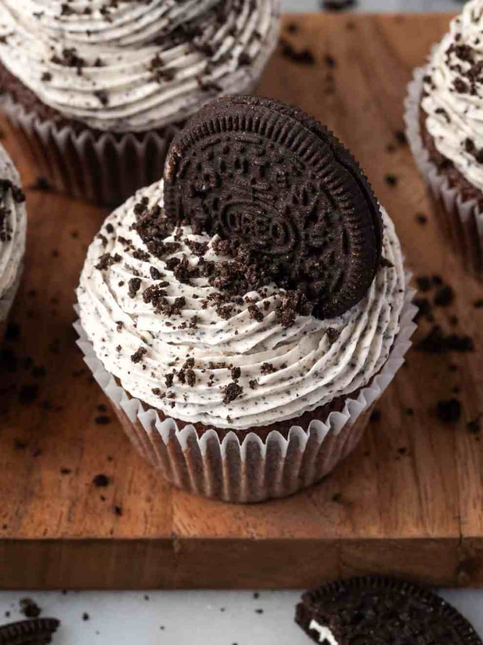 Oreo-lovin’ dreamboats, incoming! These chocolatey bombs are hiding a sneaky lil’ cookie at the bottom and have a cloud of buttercream and cookie crumbles on top.