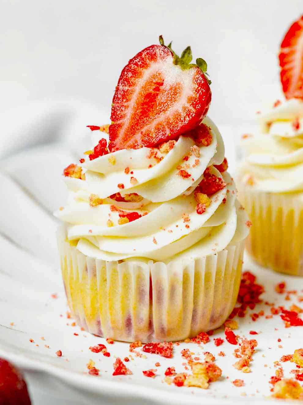 Check out this fluffy vanilla number with a light yet rich frosting and strawberry crunch topping. Even if baking is not your skill, they end up looking pretty enough for Instagram and also delicious as heck!