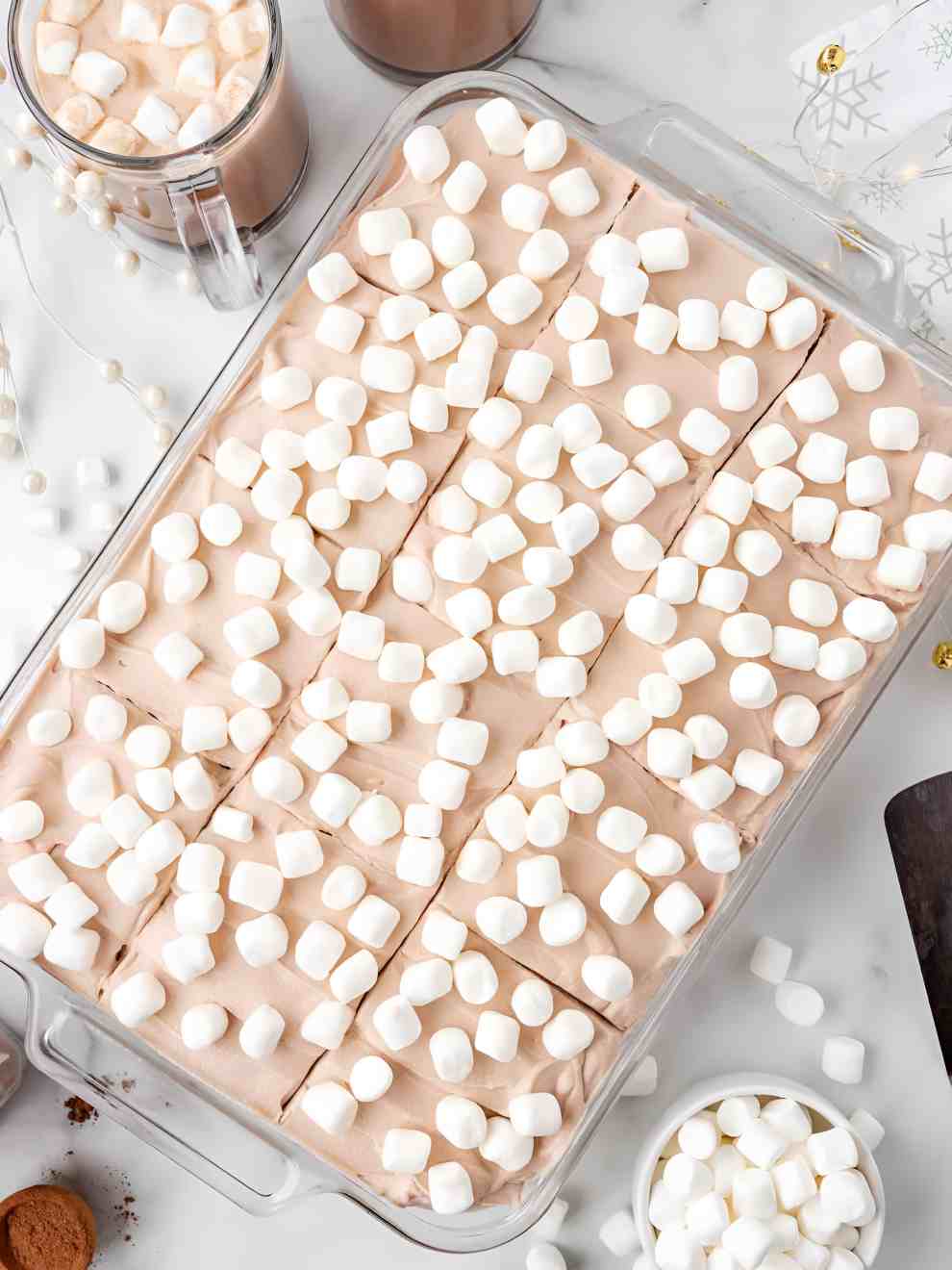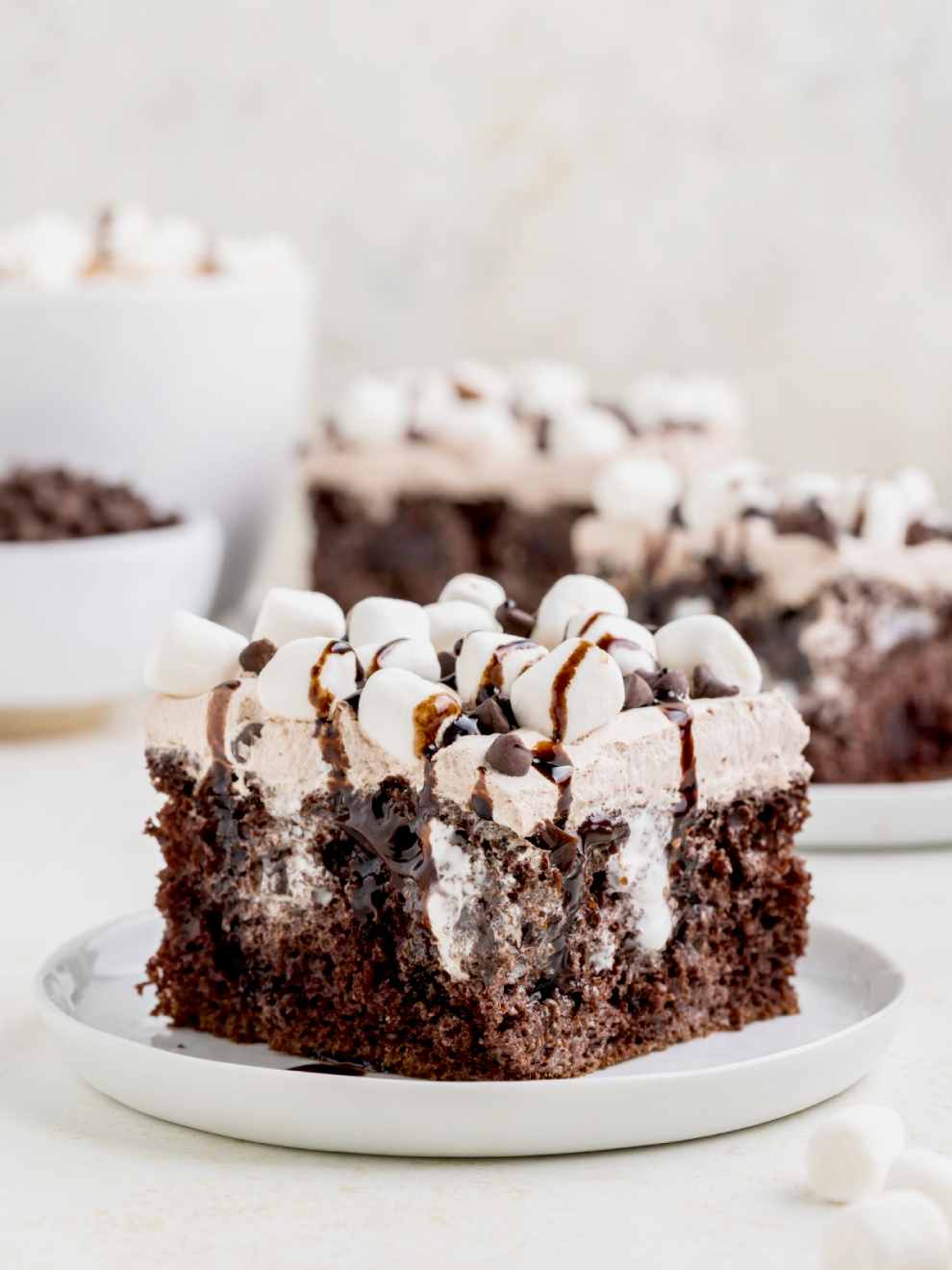 It’s hot cocoa in cake form, topped with whipped cream and mini marshmallows. A lazy treat for anyone who loves to sit by a fire and eat cake with a spoon.