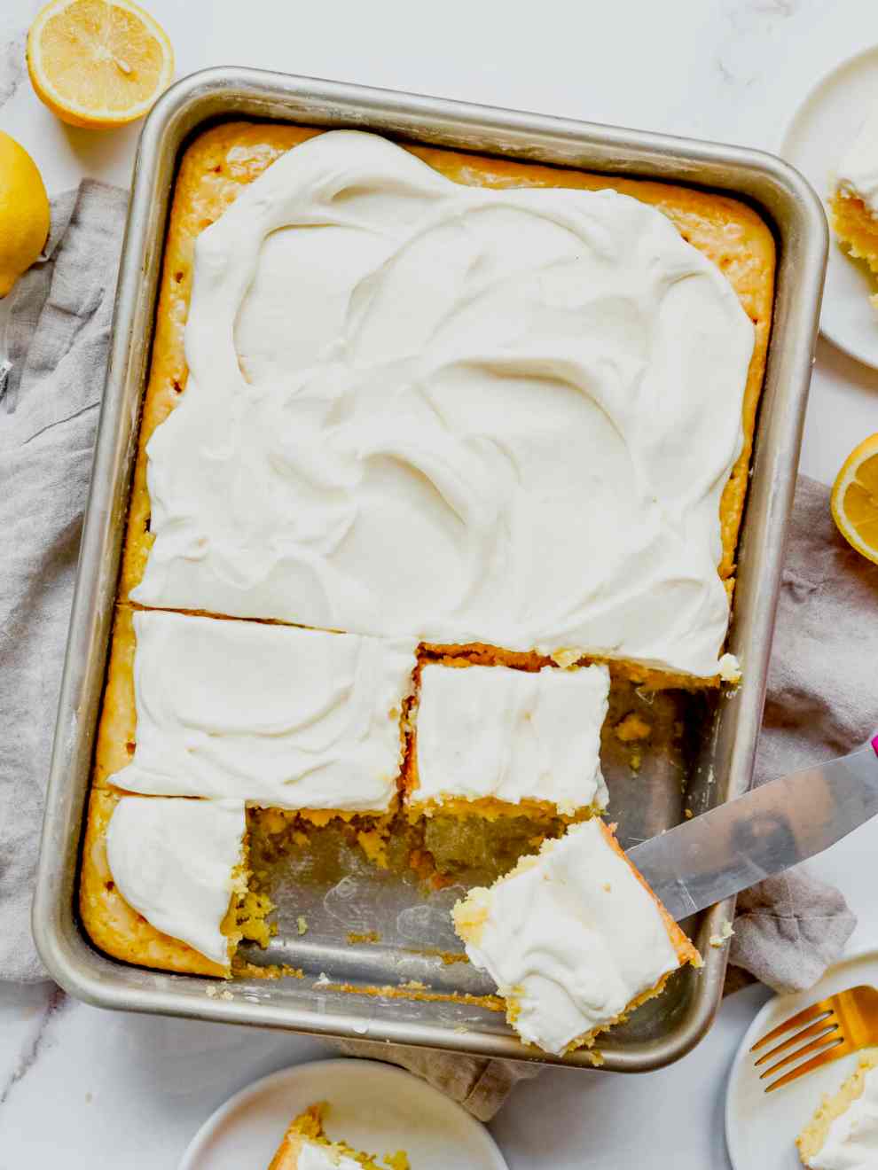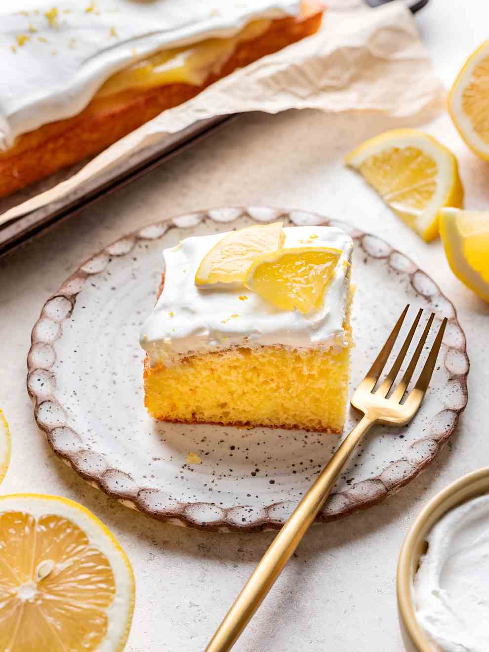 Moist, lemony, and a total crowd-pleaser, this cake is heaven in every bite! It’s deliciously hard to resist with its bite of lemon glaze and whipped cream-on-top goodness.