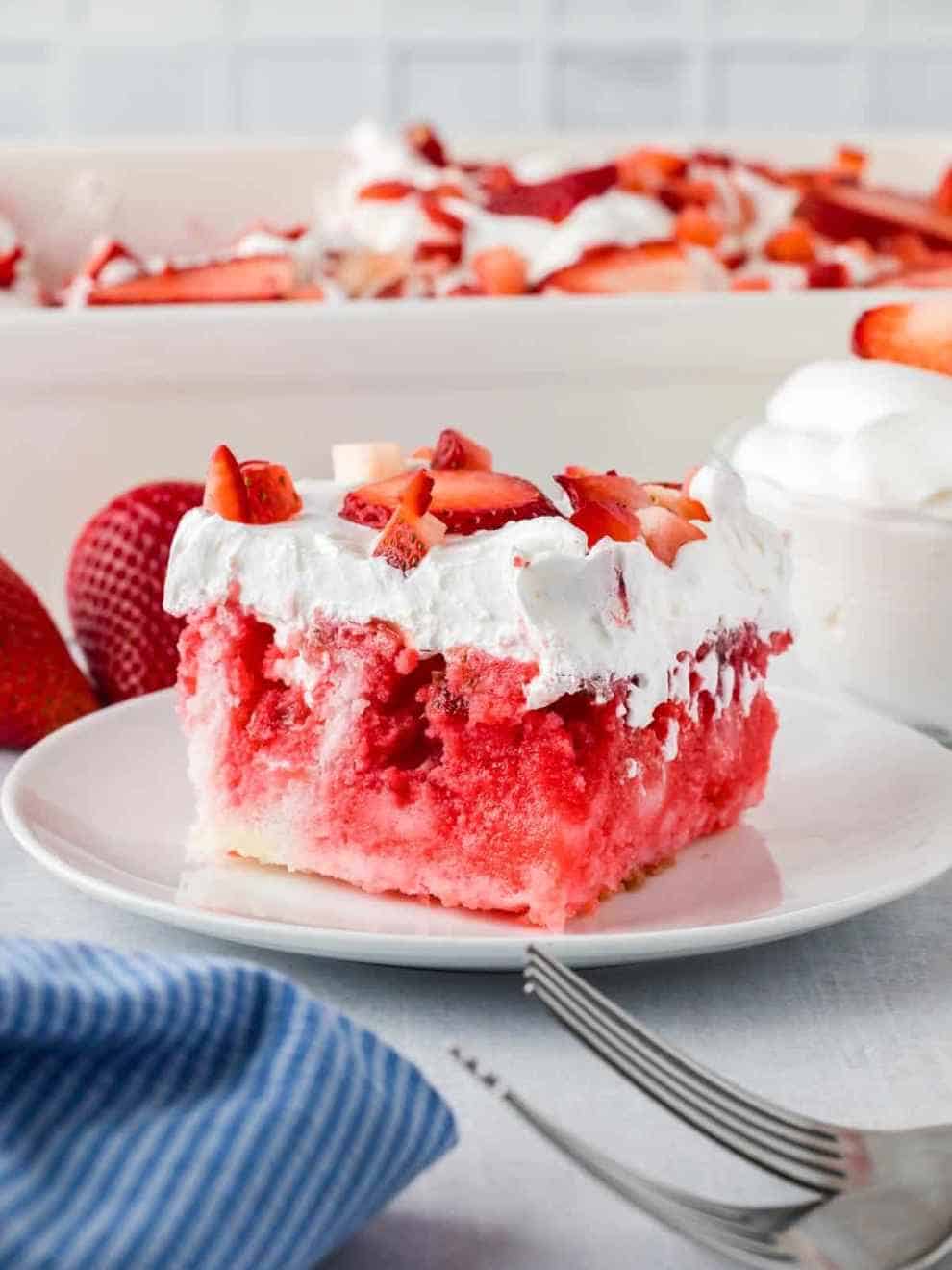 Basic vanilla cake gets into a long-term relationship with strawberry jello, resulting in a dessert that’s both simple and satisfying.