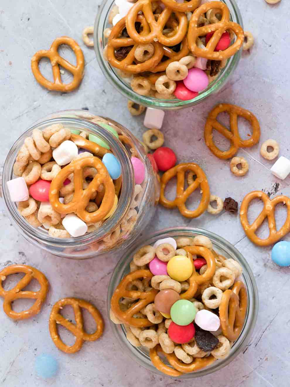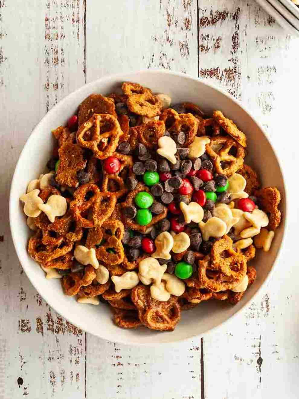 This snack mix goes HAM with butter toffee pretzels, Goldfish crackers, chocolate chips, and M&Ms. It’s sweet & salty snacking excellence, with that hit of crunch from the toffee coating, and added party vibes from the colorful candies.