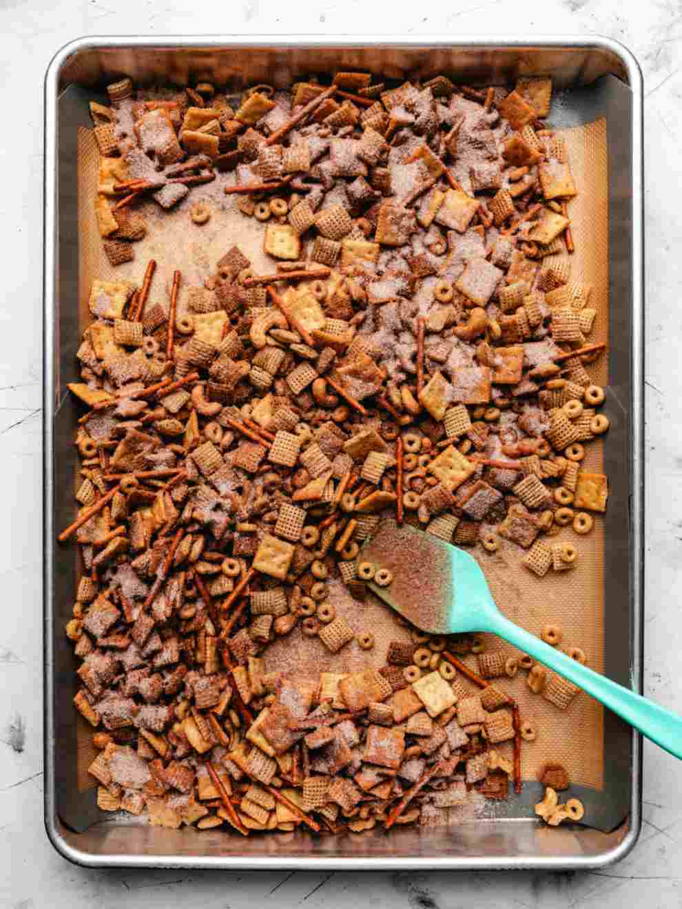 This mix has all the crunchy and sweet stuff to bake into a snack of dreams. It’s honestly just Chex, pretzels, and nuts bathed in butter, but it’s soooo good!