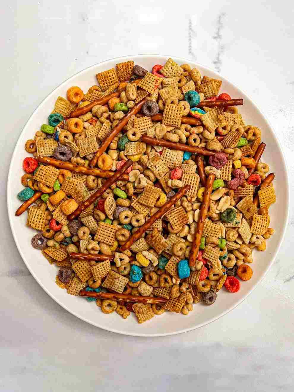 Chex, Cheerios, and pretzels join forces in a snack that banishes weak store-bought versions to the timeout corner. Coated in buttery Worcestershire and spices, then low-and-slow-roasted for a full-on three hours.Carbs + protein mean guilt-free snacking… so nosh now and worry about New Year’s resolutions later!